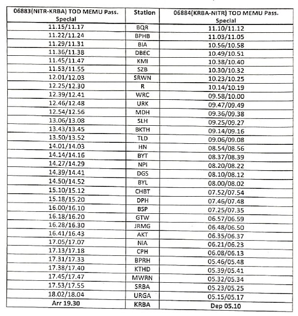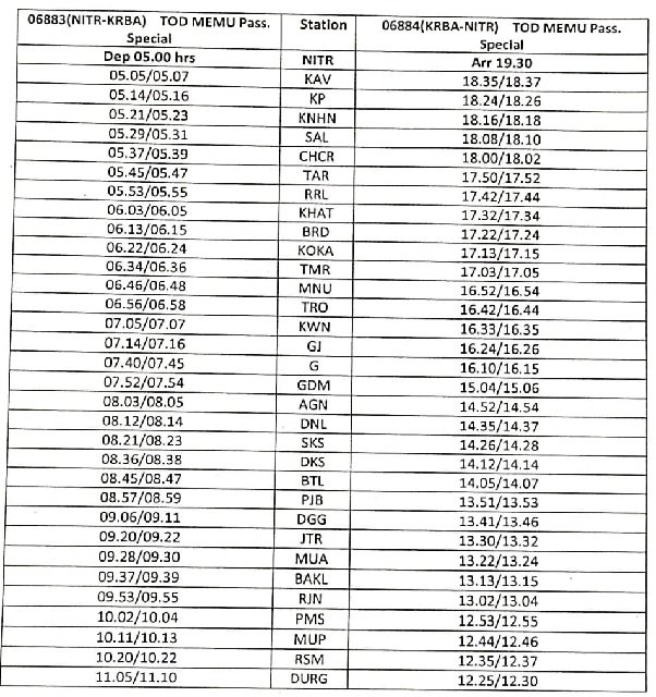 तथा 19.30 बजे कोरबा स्टेशन पहुंचेगी | इसी प्रकार गाड़ी संख्या 06884 कोरबा- नेताजी सुभाष चंद्र बोस(इतवारी) मेमू, कोरबा स्टेशन से प्रतिदिन सुबह 05.10 बजे रवाना होकर बिलासपुर 7:25 बजे, भाटापारा 8.37 बजे, तिल्दा नेवरा 9:06 बजे, रायपुर 10.14 बजे, दुर्गा 1225 बजे गोंदिया 16.00 बजे, तथा 19.30 बजे नेताजी सुभाष चंद्र बोस(इतवारी) स्टेशन पहुंचेगी|
